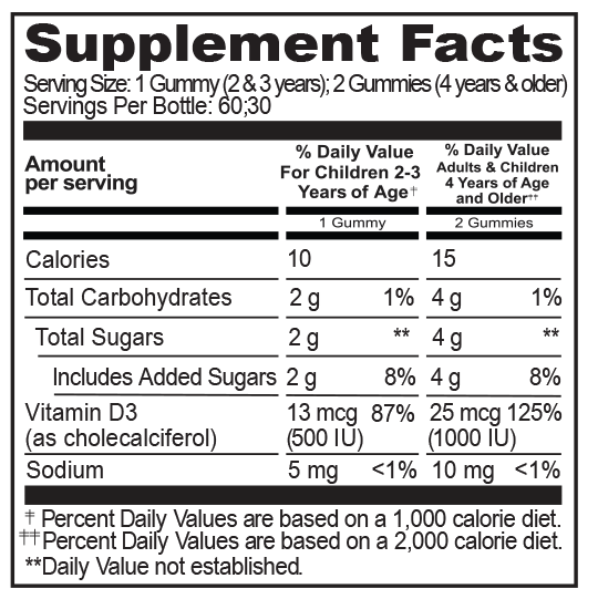 Our gummies are a delicious way to ensure kids receive adequate Vitamin D3. Vitamin D3 supports immune health, bone strength, and muscle function by aiding in calcium and phosphorus absorption.