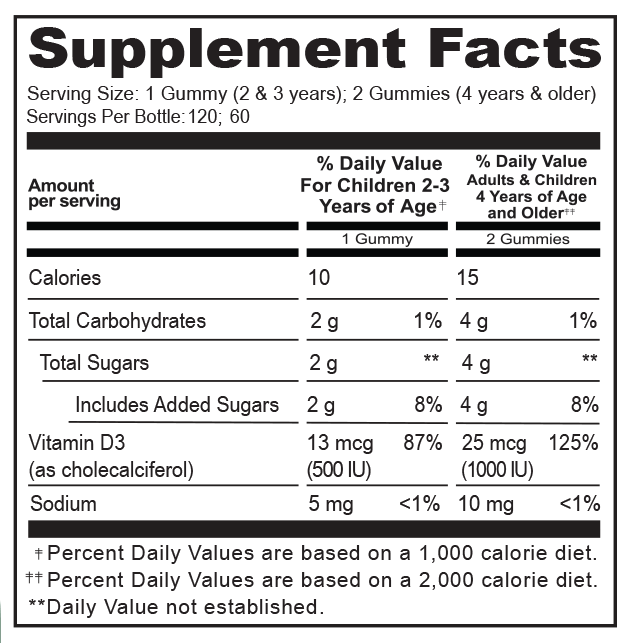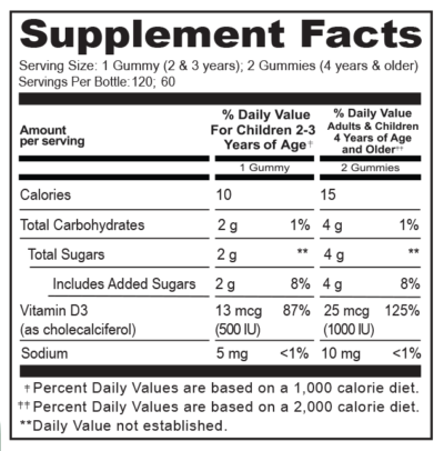 Vitamin D3 gummies help support normal growth and development of bones and teeth. It also helps the body absorb Calcium.